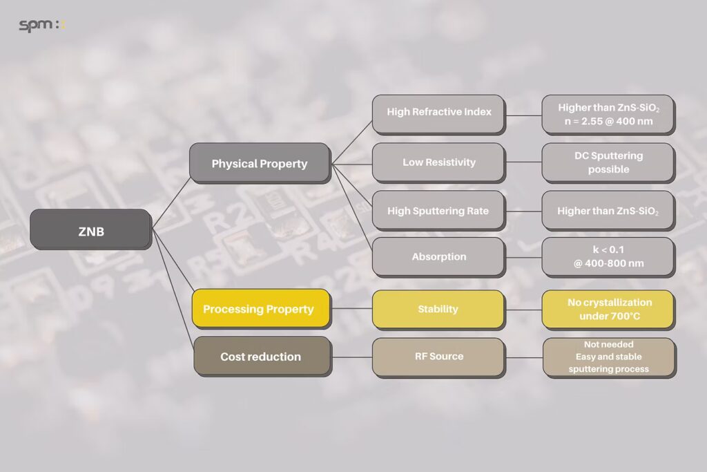 ZNB can be sputtered with DC and is very stable. Under 700°C, there is no grain growth. The refractive index is higher than ZnS-SiO2. The absorption is k < 0.1 @ 400 – 800 nm.